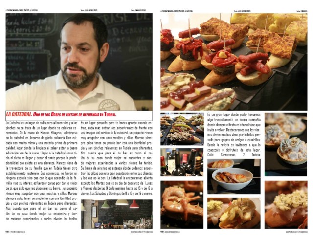 La Catedral es un lugar de culto pero al buen vino y a los pinchos no se trata de un lugar donde se celebran ceremonias. De la mano de Marcos Milagro, adentrarse en la catedral es llenarse de gloria culinaria bien cuidada con mucho mimo y una materia prima de primera calidad, lugar donde la limpieza el saber estar la buena educación van de la mano. Llegar a la catedral como diría el dicho es llegar y besar el santo porque la profesionalidad que existe es una Alavanza. Marcos viene de la trayectoria de su familia que en Tudela tienen otro establecimiento hostelero. Sus comienzos no fueron en ninguna escuela sino que con lo que aprendió de la familia mas su interés, esfuerzo y ganas por dar lo mejor de si, que es lo que nos plasma en su barra.