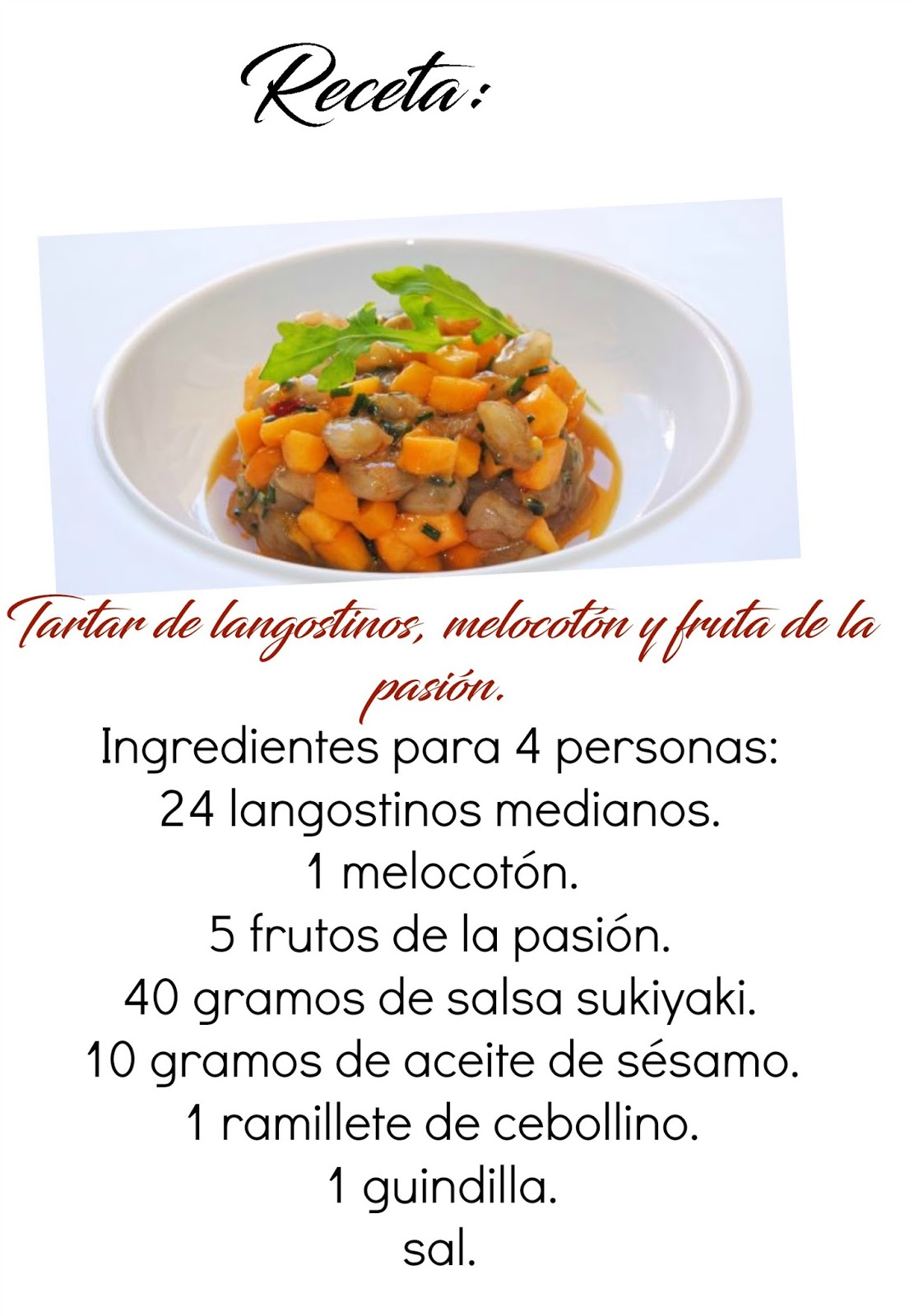 Receta. Tartar de langostinos, melocotón y fruta de la pasión.